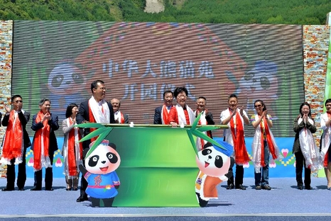 林鄭月娥(前排右)與四川省人民政府副秘書長趙衛平(前排左)在臥龍自然保護區主持「中華大熊貓苑」開園儀式,一同拉動啟動裝置