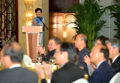 林鄭月娥當天晚上在成都出席特區政府感謝晚宴。圖為林鄭月娥於晚宴上致辭