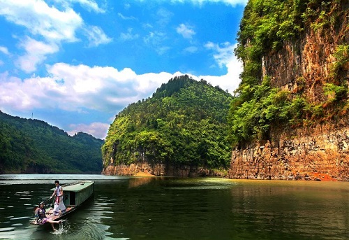 10公里的水域兩岸,上下天光,江水如鏡。無數大小不均的溶洞只在石壁上隱隱張個洞口;樹木婆娑,常見野生獼猴攀爬跳躍,覓食嬉戲;河上捕魚人家,輕舟伐步,對空放歌,青山在浮云與水霧的籠罩下若隱若現。人與大自然的山、水、植物、動物在這里都實現了完美的和諧共生,人類以更為寬廣的博愛精神對大自然給予人文關懷。