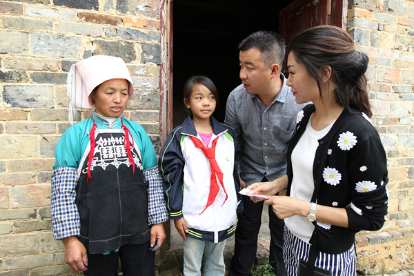 陈碧秀女士与云雾镇镇长杨华军向学生陈矣花(左二)捐助第一个月的300元学费、生活费。