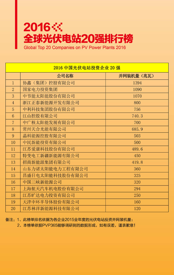 本次榜單根據上一年度全球光伏電站行業各企業全年主營產品經營收入、出貨量、並網裝機規模等財務數據的高低排出先後名次。