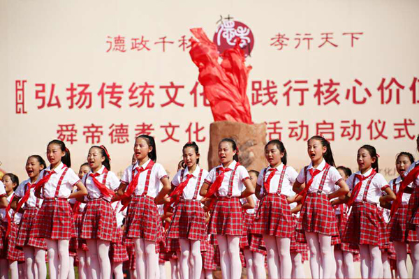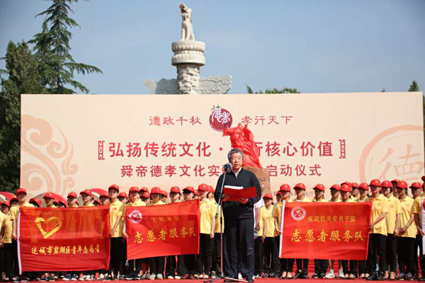 盧展工宣布“弘揚傳統文化 踐行核心價值”舜帝德孝文化實踐活動啟動,王世明為“社會主義核心價值觀教育學院”授牌,薛延忠點燃主火炬,樓陽生為上海部分中小學校“德孝文化教育基地”授牌,胡蘇平為赴上海宣講優秀傳統文化的“古中國”文化小使者授旗。