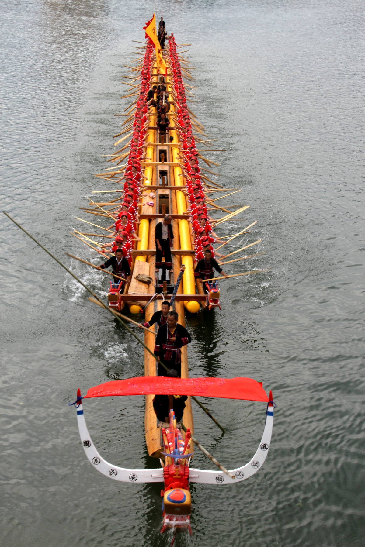 “中華苗族第一龍”全長77.8米,寬2.5米,其中,龍身為66米,龍頭、龍尾各5米;整舟由一條主舟與兩條子舟組合而成,主舟居中,子舟為輔船各自組裝在主舟左右,兩條子舟分別長58米。其舟撓片160支,可承載漿手160人,舵手、鼓手、鑼手和火銃手共20人,總計180人。