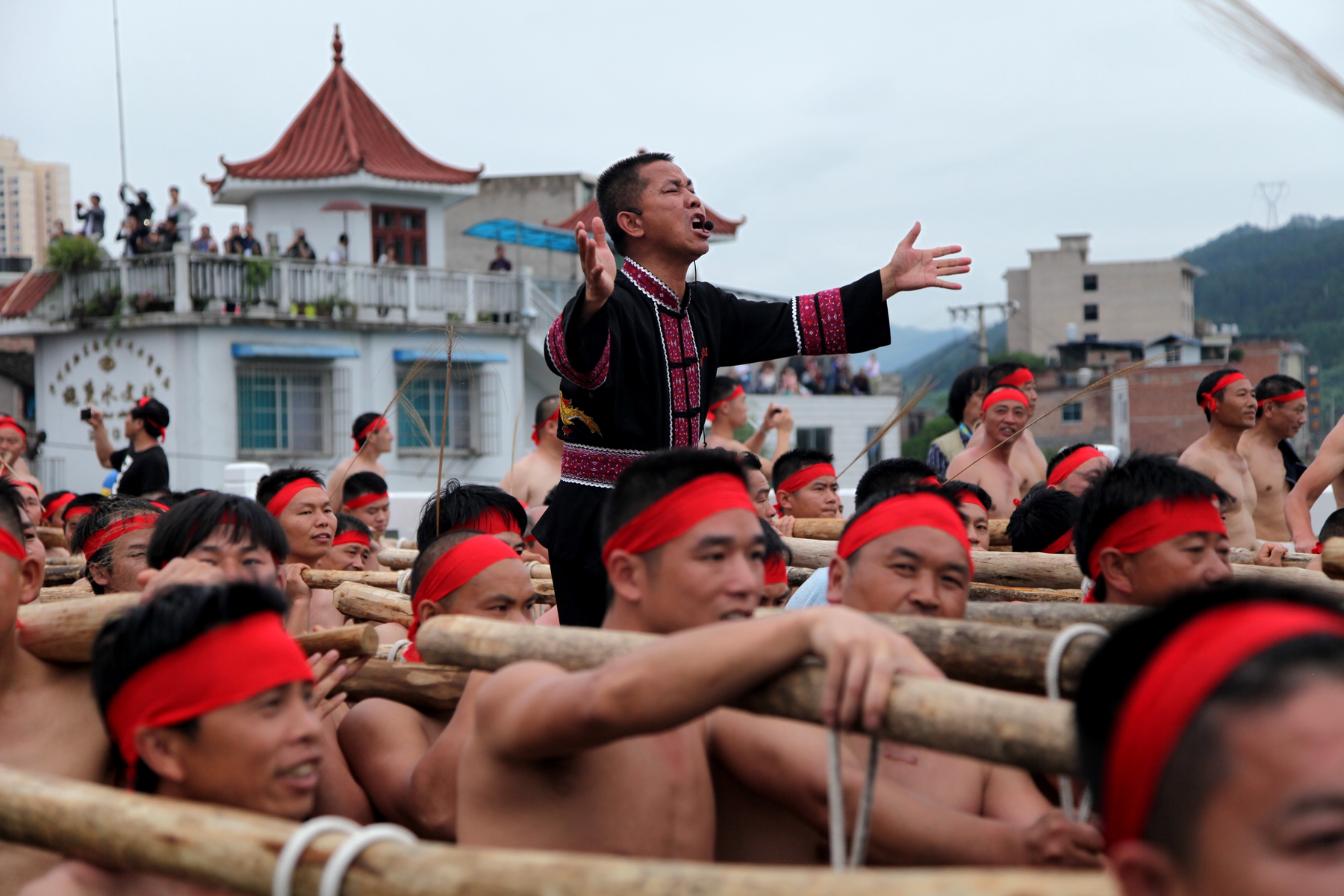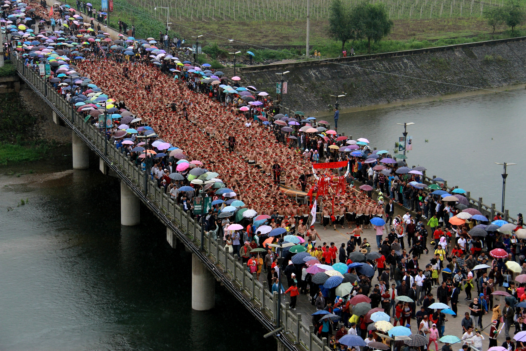 下水儀式當天,1560名光著上身,頭、手捆著紅飄帶,腳穿草鞋的苗家漢子在雨中,抬著巨龍,從施秉瀾泊灣巡遊到了龍下水之地——施秉老大橋,全程3公裏左右,壯漢們邊抬邊呐喊,場面壯觀、氣勢恢宏。抵達老大橋處之後,4台大吊遂將巨龍送入了舞陽河中。隨後,168名苗族婦女“騎”著剛下水的“中華苗族第一龍”,整齊揮動手中的船槳,在舞陽河上進行試航表演。她們身著紅色的苗裝,豔麗無比,構成了一道靚麗的風景,吸引了許多市民和遊客駐足觀看。