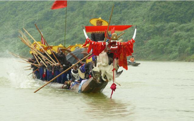獨木龍舟龍頭雕刻精美,宛似牛角的龍角上,通常寫有“風調雨順”、“國泰民安”等吉祥語。平時舟身被放置在“龍船硼”內(村口專門搭建的亭子裏),龍頭放在村裏推選出的鼓主家,每年農曆5月20日至23日期間巫師會按傳統做法“起龍”,之後用竹篾將子舟和母舟並列紮成一排,裝上精雕細刻的五彩龍頭。