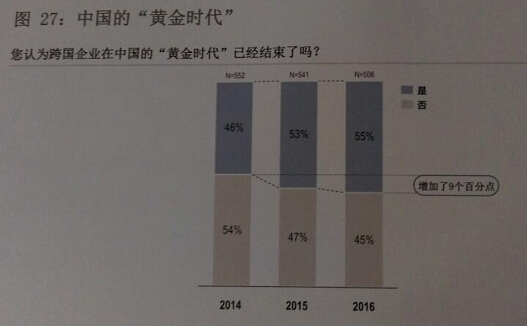 【香港商報網訊】记者李苑立报道:7日,中国欧盟商会在北京、广州两地同步发布的《商业信心调查2016》(下简称调查)显示,已有55%的在华欧盟企业认为,跨国公司在中国投资的“黄金时代”已经结束。他们开始对中国的经济市场环境持悲观态度,缩减投资、计划裁员的企业数有所上升。