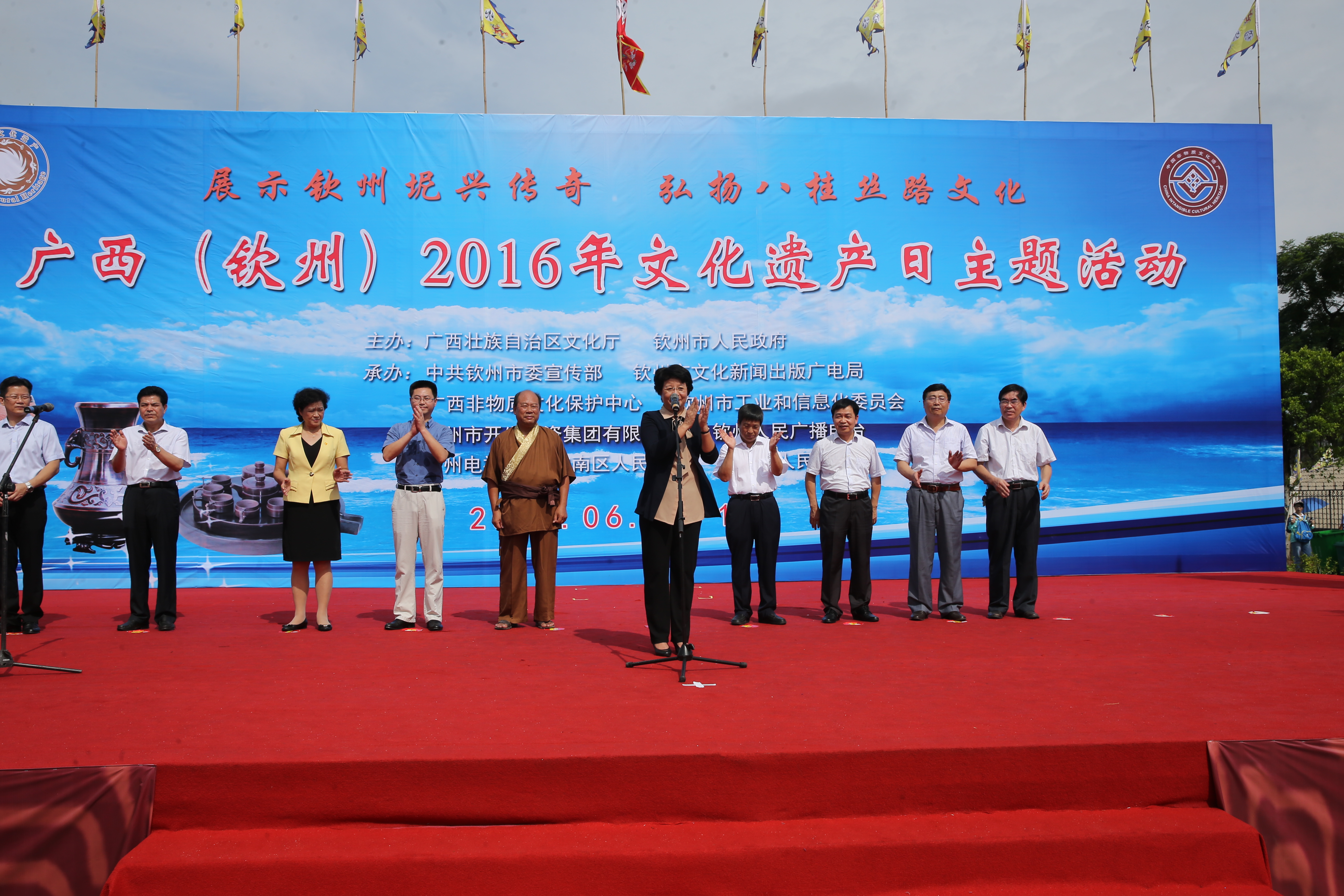 在6月11日中國第十一個文化遺產日的當天上午,位于欽州市區欽江畔的坭興陶千年古龍窯燃起熊熊窯火,廣西以欽州市為主場城市舉辦的廣西(欽州)2016年文化遺產日主題活動拉開序幕。活動期間,還舉辦了千年坭興陶古龍窯火祭大典、非遺項目和傳統技藝展演展示、廣西各市非物質文化遺產百米宣傳長廊、中國“四大名陶”展出、全國百家媒體“聚焦非遺”、產品展銷、坭興陶產業園招商推介等系列活動。參加主題活動的市民群眾目睹了古老的草龍取火之神秘程序,感受薪火相傳熊熊燃燒的窯火,見證鐫刻在坭興陶身上難以磨滅的文化印記,欣賞欽州本地的粵劇、采茶戲、跳嶺頭、武術、舞春牛、舞麒麟等非物質文化遺產項目展演和桂林圓竹剖絲團扇制作技藝、柳州三江侗族木構建筑營造技藝、百色靖西壯族織錦技藝、防城港京族獨弦琴藝術、河池銅鼓習俗(演奏技藝)、北海貝雕技藝等傳統技藝展示,更看到與欽州坭興陶并稱“中國四大名陶”的江蘇宜興紫砂陶、云南建水陶、重慶榮昌陶同時展出。