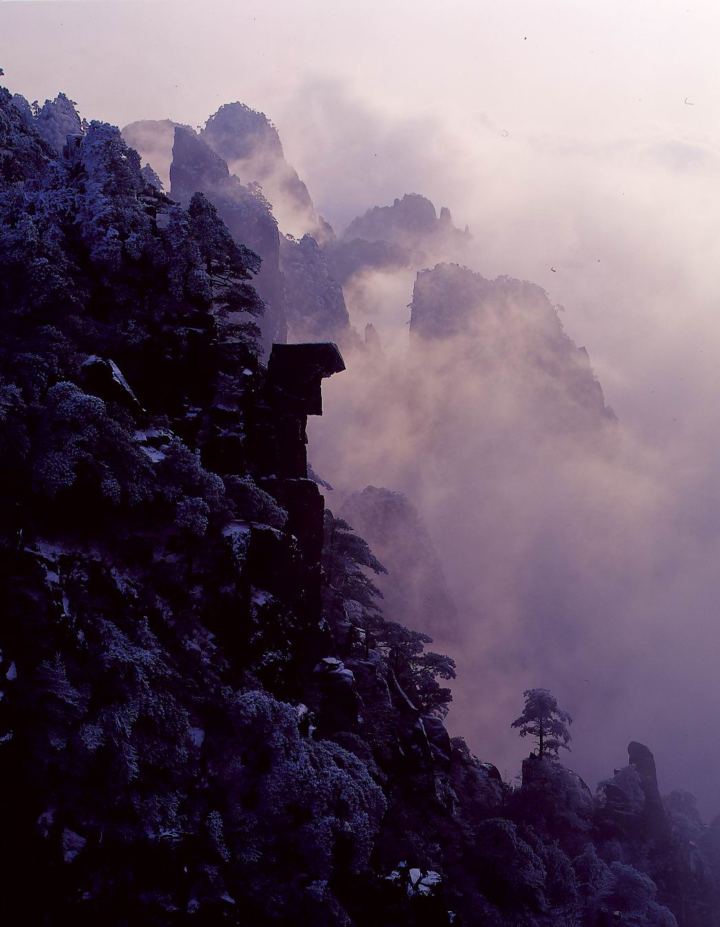 漫天的云霧和層積云,隨風飄移,時而上升,時而下墜,時而回旋,時而舒展,構成了一幅奇特的千變萬化的云海大觀。“白云倒海忽平鋪,三十六峰連吞屠。風帆煙艇雖不見,點點螺髻時有無”(清人江鶴亭)。風平浪靜之際,白云茫茫,一鋪萬頃。無數的山峰,被白云淹沒,只剩下幾個峰尖,像是大海中的島嶼。轉瞬之間,又波起峰涌,浪花飛濺,驚濤拍岸。尤其是在雨雪天氣之后,日出或落日時的“霞海”最為壯觀。妙在似海非海,非海似海。云霧的飄蕩,使黃山呈現出靜中寓動的美感。動靜結合,造化出變幻莫測,氣象萬千的人間仙境。