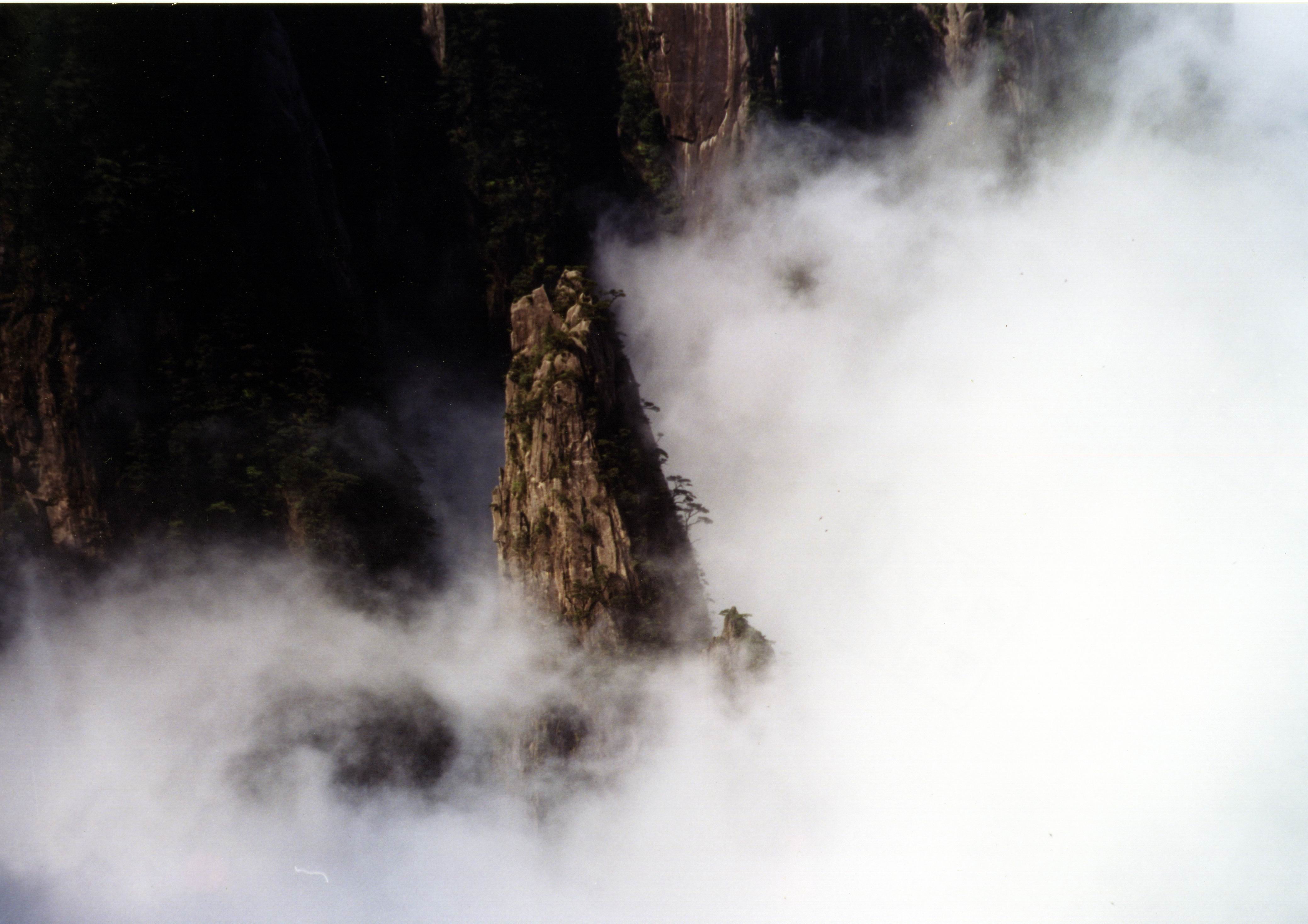 正想著,那原先推積在溝壑深處的云霧, 飄飄忽忽地開始往上涌了。借著風的推動,云層時而上升,時而下墜, 時而翻涌如浪花飛濺,時而舒展如霓裳羽衣……遠遠近近的山峰,被白云淹沒,僅剩下大大小小的島嶼,將云比喻為海真是準確無比。