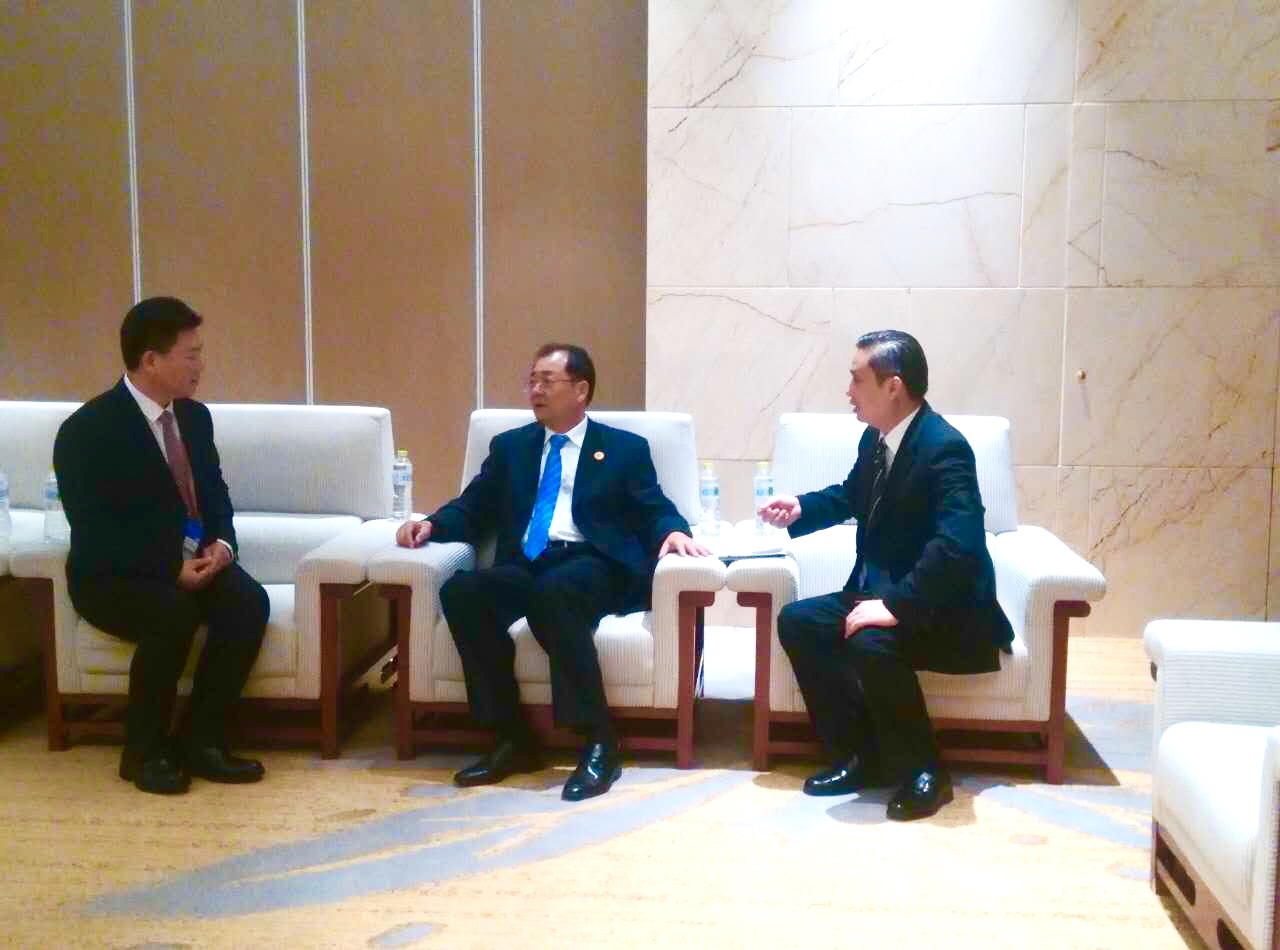 广西壮族自治区人大副主任、区总工会主席王跃飞(中)会见香港进源集团董事局主席吴进枝(左)、东兰县人民政府县长徐迪克(右)