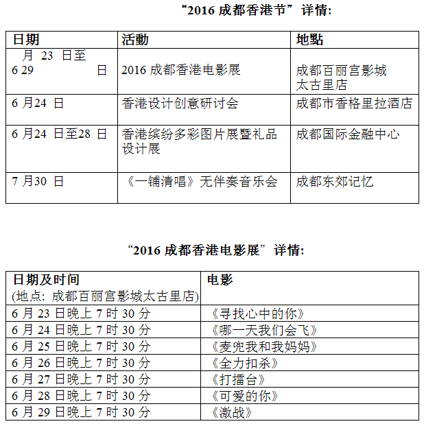 香港特區政府駐成都經貿辦主任劉錦泉表示,香港和四川的關系非常密切,香港一直是四川最大的境外投資來源地,而在國家“一帶一路”的戰略布局下,四川與香港的經貿及文化往來將更頻繁。舉辦“2016成都香港節”旨在進一步加強兩地在經貿往來和文化創意產業方面的交流合作,系列活動包括介紹香港創新禮品設計的研討會及展覽、以香港美景、美食、節慶及生活為主題的香港圖片展覽、由香港樂團以嶄新方式演繹香港文化的音樂交流,以及今日同步開幕“2016 成都香港電影展”。