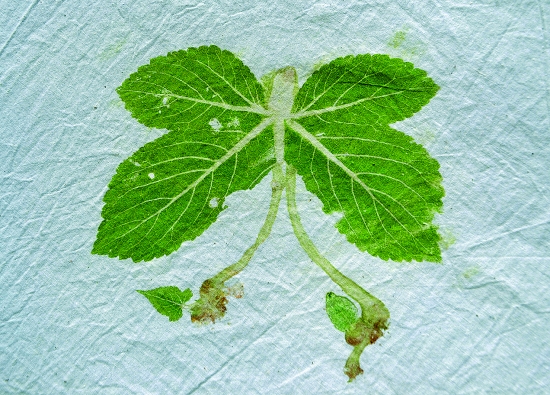 捶草印花的原料包括白棉布(當地人俗稱土布、粗布)、芊棒棒草(學名太陽花,中藥名老鸛草)等特有的幾種莖葉漿液豐富、具有染色功能、柔韌性好的植物。具體的操作程序是把采摘的新鮮的“芊棒棒草”夾在白棉布裏,擺放成自己喜歡的花型圖案,然後鋪展在平整的石頭上,用木棒輕輕捶打出草的汁液,隨著一下下的捶打,草兒的葉脈紋絡就清晰地滲印在了白布上,形成白底綠花的圖案。這樣,一塊綠色環保、純手工、純天然的花布就印染好了。