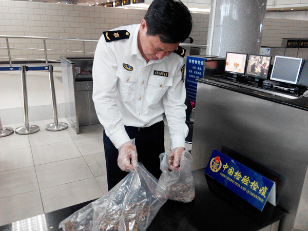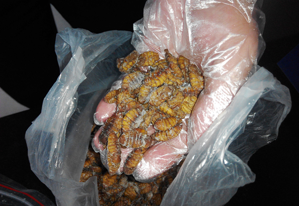 【香港商報網訊】記者陸紹龍、通訊員張國強、張明瑤報道:6月27日,珠海檢驗檢疫局拱北辦事處工作人員截獲一內地旅客攜帶一批幹制蠶蛹入境,共計1.6公斤,數量約為500只。由於其未辦理檢疫審批手續,檢驗檢疫工作人員已依法對該物品作截留銷毀處理,並對部分有黴變的蠶蛹采樣、封裝,送往檢驗檢疫技術中心實驗室作進一步檢驗。