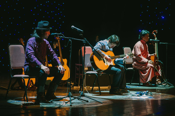 開場,陳彥宏老師攜手蒙古呼麥王子巴音牧仁及馬頭琴演奏家白噶拉,帶大家體驗邊疆西域及蒙古的駿馬奔馳。山鳴穀應的呼麥聲,隨著鏗鏘有力的吉他音樂響起,一幅幅充滿異域風情的草原畫面一一在眼前呈現。