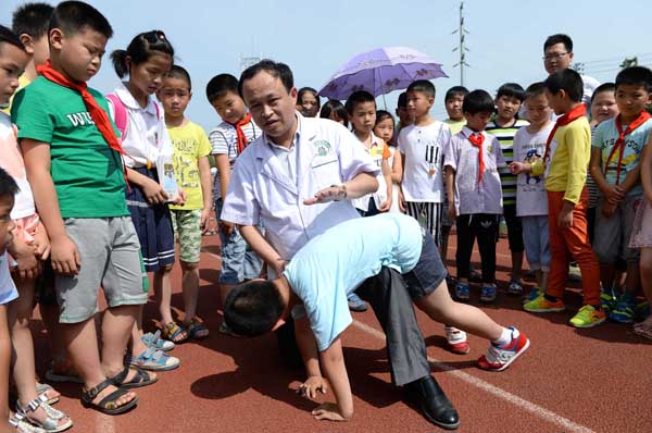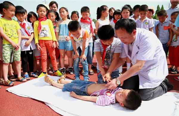 【香港商報網訊】通訊員解琛報道:6月30日,在合肥市瑤海區大興鎮東風小學,醫務人員現場教授孩子們防溺水安全急救技能。