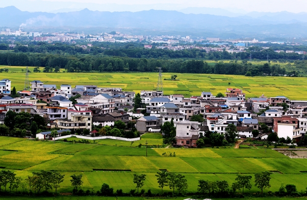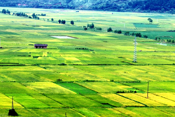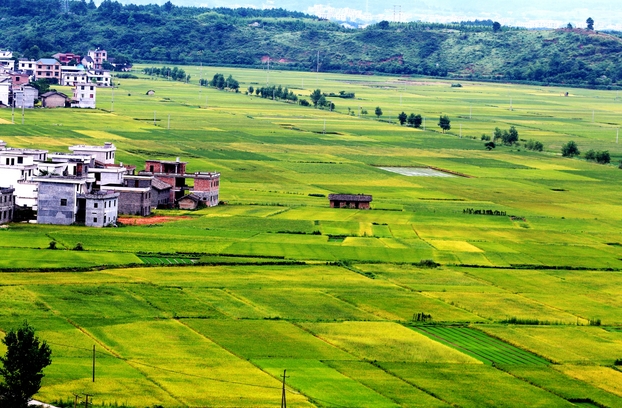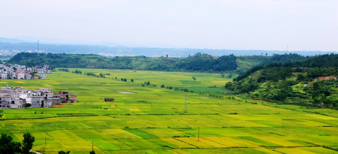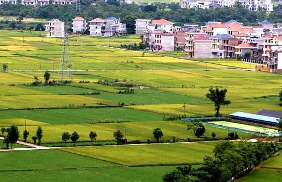 【香港商報網訊】2016年7月3日,江西省遂川縣枚江鄉稻田一片片開始金黃田園風景。當下江西省遂川縣准備進入早稻豐收收割季節,早稻田裏,沉甸甸的稻穗上了穀子飽滿,黃綠相間的稻田與綿延起伏的山川、雲朵、樹林和房舍構成一幅色彩絢麗的田園風景,不是油畫勝似油畫美麗壯觀,,置身其中讓人陶醉不已。(李建平攝)