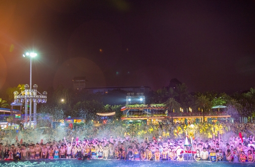 現場DJ憑借熟練的打碟技巧,將多首節奏感強勁的電子音樂進行改編剪接,加上MC極具個人感染力的即興說唱、Beatbox演奏,在世界級的燈光、音響、酷炫的夜光飛人空中煙花特技表演的配合下,氣氛隨之推向高潮,過萬遊客在水中隨著勁爆樂感狂歡,體驗城中最勁爆的水上音樂派對。