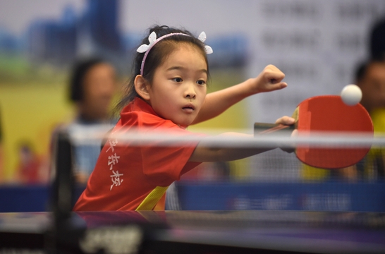 在合肥市第十一屆全民運動會乒乓球少年組比賽現場,選手程一江然在進行女子單打項目的比賽