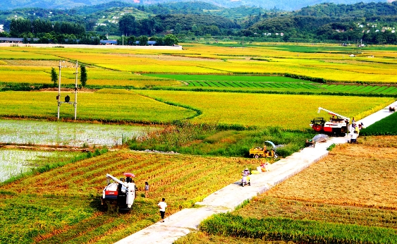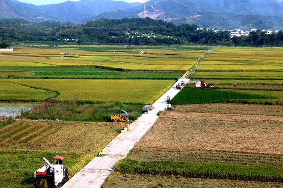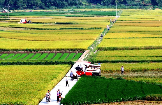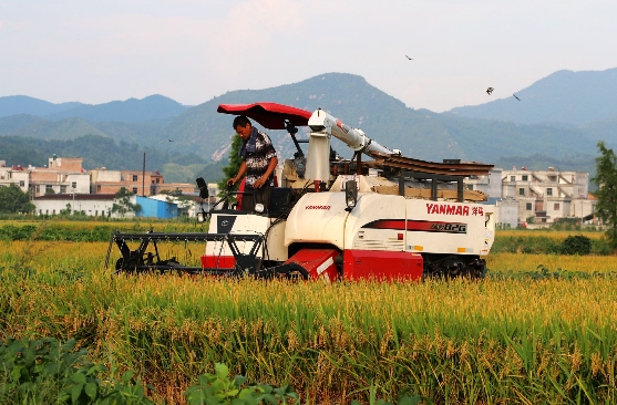 【香港商報網訊】2016年7月7日,江西省遂川縣萬畝雙季稻高產種植示范基地,農民在忙著收割早稻、趕插晚稻,正式進入“雙搶”季。田園中忙碌的收割機與金黃色稻穀和翠綠的秧苗,構成了美麗的鄉村農忙豐收圖景。(李建平攝)