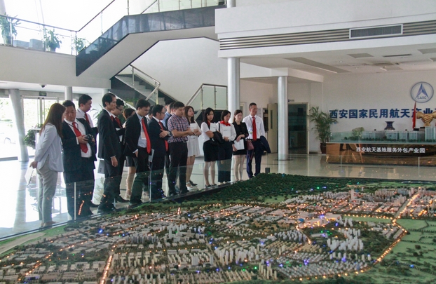 最後,考察團一行來到了國家級陝西航天經濟技術開發區,登上了20層高的九天攬月閣,俯瞰開發區全貌。據西安航天基地招商局副局長劉煜介紹,開發區總規劃面積86.65平方公裏,依托陝西航天工業雄厚的綜合實力和堅實基礎,充分發揮航天科技對國家戰略新興產業的引領作用,立足航天產業,發展新興產業,推進軍民融合,帶動產城融合,在謀求錯位發展中建設世界一流航天產業新城,已初步形成了以航天及軍民融合產業、衛星及應用產業、新能源產業及新一代信息技術產業為主導的四大產業集群。