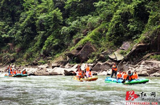 東江漂流位于資興市黃草鎮境內,是東江湖國家5A級旅游景區的核心景點之一,全長28公里,落差75米,有急險灘108個,為高山峽谷漂流。