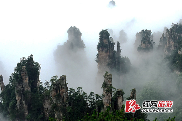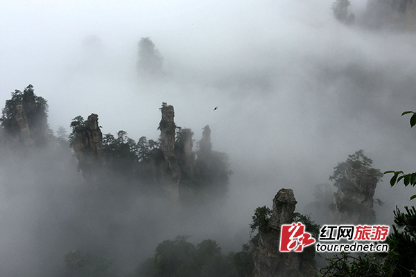 連續的強降雨為張家界武陵源天子山景區帶來了雨霧繚繞的仙境般美景。