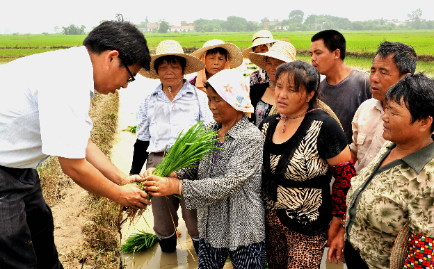鎮農技站站長甘傳良在神墩村楊前村民組田間為農民傳授災后水稻補栽技術。