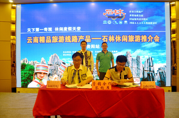 推介會上,石林風景名勝區管理局副局長王永喬與荔波漳江風景名勝區管理處處長助理付小明簽訂了營銷合作協議。