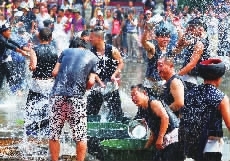 兩條潑水龍從后山騰云駕霧來了,20米高的水柱直沖云霄。潑龍水、接龍氣了!霎時,如甘露降臨,清亮的水在廣場上飛舞,歡快的人群迎水、互相潑水,洗凈過往的煩惱和不快,迎接充滿陽光的土家人的祝福,歡笑聲響徹土司城。