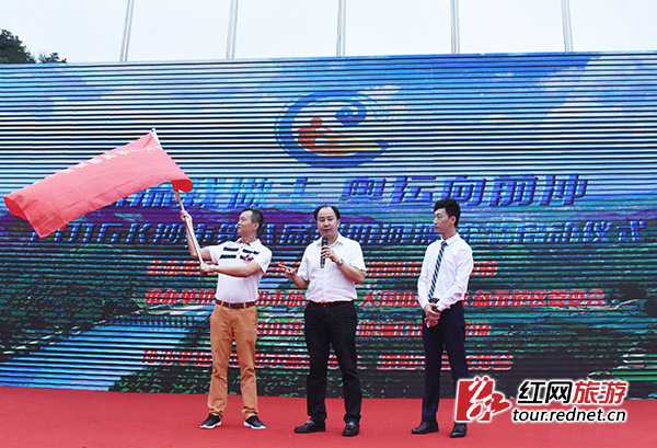 長沙市旅游局黨組書記、局長孫衛東為瀏河源房車自駕車營地啟動授旗。