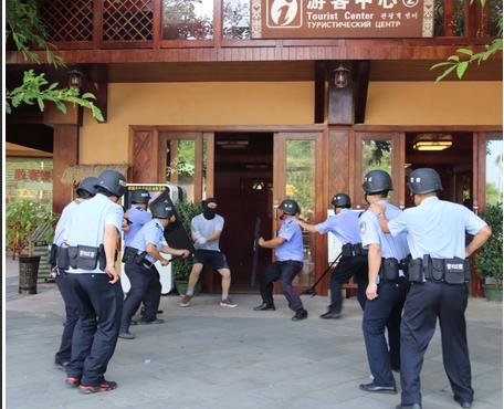 本次參演的100餘名公安民警、消防隊員、醫護人員和景區工作人員通力協作,多警聯動,相繼進行了擒拿格鬥、設卡盤查、堵截擒敵、解救人質、火災除險和處置突發性群體事件等科目的模擬實戰演練。