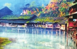 在熙熙攘攘的芙蓉鎮碼頭,客船每天往返于王村與小溪景區之間。迎面吹來的風涼爽、清新,不時,對面漂來一只小漁船,船夫搖動著雙槳吆喝著。彎過幾道彎,土家吊腳樓在前方若隱若現,小溪到了。