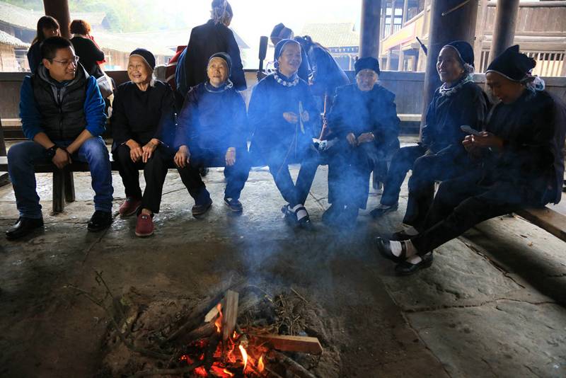 都說侗族建筑有“三寶”:鼓樓、涼亭、風雨橋。鼓樓在侗族叫做“堂瓦”,是公共場所的意思。鼓樓是侗民族聚會、議事、休息和娛樂的場所。夏日遮陰納涼,冬季圍爐取暖,氛圍其樂融融,真可謂是侗家兒女安放精神之所。鼓樓里游客和本地人間次而坐,談天唱歌,毫無違和之感。