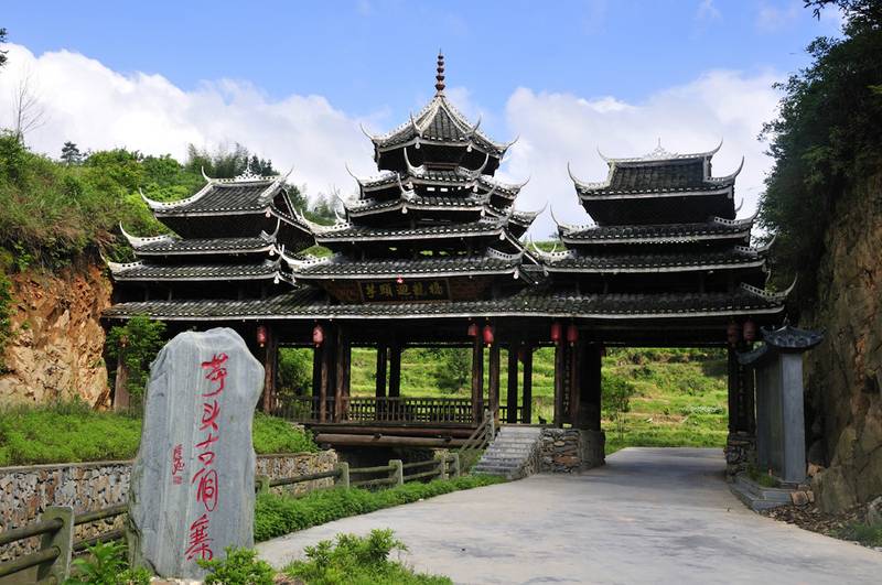 風雨橋又稱花橋,亦叫福橋,芋頭古侗寨入口處的“迴龍橋”是典型的風雨橋建筑,橋梁由巨大的石礅、木結構的橋身、長廊和亭閣組合而成。除石墩外,全部為木結構,由卯榫連接,結構嚴密,即使歷經千秋萬代也巋然屹立,可謂流芳百世的建筑瑰寶。