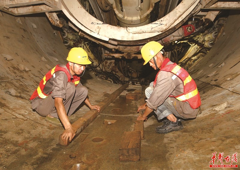 7月31日,施工人員在鋪設鐵軌和方木,方便盾構機掘進。當天,“先鋒號”盾構機在長沙地鐵3號線一期工程湘龍站始發,開始其向西掘進旅程。地鐵3號線計劃2018年通車,目前已陸續開始區間施工,部分車站進入附屬結構施工階段。 記者 趙持 攝