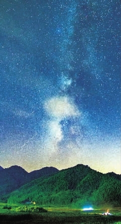 夏天的紫鵲界,佳禾吐翠,如排排綠浪,青翠欲滴,似從天而瀉的一彎彎碧玉。夜晚,天上的繁星與星星點點的燈光一起閃爍,仿佛置身于一座幽深空蒙的世外桃源。在這里,沒有城市的光污染,每一個觀景臺都是一個絕佳的觀星點。隨意擇一處,支起帳篷和腳架,調整好相機靜靜守候,待群星璀璨之時,定格那美麗的星空畫卷。