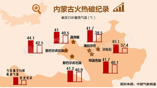 昨天,北方的高溫繼續發展增多,內蒙古中東部和東北多地出現高溫天氣。監測顯示,截至昨天14時,內蒙古呼倫貝爾多地氣溫超過40℃,其中,海拉爾、陳巴爾虎右旗在有觀測記錄以來首次突破40℃;新巴爾虎右旗最熱,達43.5℃。另外,額爾古納、西烏珠穆沁旗,已經破了8月極值;而東烏珠穆沁旗、圖里河的氣溫也已接近8月極值。