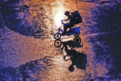 圖:昨天入夜時分,漢口一帶大雨傾盆,一位外賣送餐員冒雨送餐。記者 喻志勇 攝