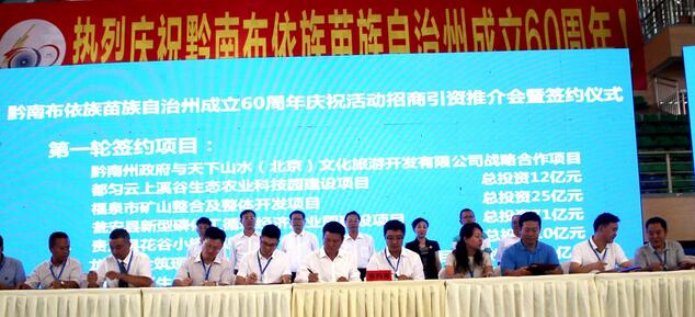 【香港商報網訊】記者黃慶松、許入介報道:8月7日,黔南布依族苗族自治州成立60周年招商引資推介會暨項目簽約儀式在都勻舉行,本次活動共簽約46個項目,簽約總投資529.43億元。