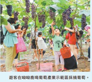 近年來,廣西柳州市鹿寨縣積極創建現代特色農業(核心)示範區,發展精品葡萄產業,并統籌開發當地的旅游文化資源,打造「呦呦鹿鳴寨美一方」休镕旅游品牌,促進農業、旅游、文化的深度融合發展,不僅讓現代特色農業綻放出新的魅力,還有效促進了當地社會經濟的發展。香港商報記者馨瑤 闕琳晶