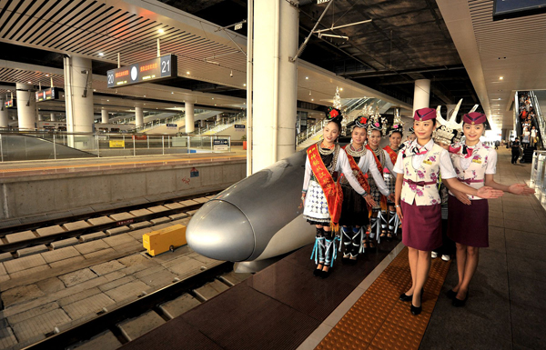 从江县各少数民族与列车乘务员在贵阳北站和神秘从江号列车合影