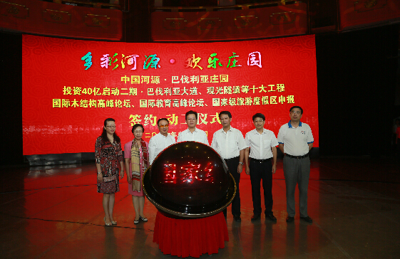 河源市市長彭建文(中)等領導為巴伐利亞莊園項目二期動工按啟動球
