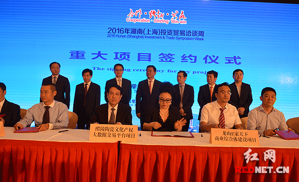 紅網上海8月18日訊(特派記者 劉怡斌)今天下午,2016年湖南省(上海)投資貿易洽談周“工商界知名人士懇談會暨重大項目簽約儀式”在上海華亭賓館舉行,現場簽約21個投資項目,投資總額395億元、引進資金377億元。本次“滬洽周”期間,全省共有354個項目簽約,總投資2057億元,引進資金1977億元。
