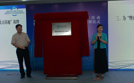 澳門中聯辦廣東聯絡部部長張春昉、香港中聯辦廣東聯絡部副部長羅江、廣州市青聯副主席王嬋娟為15家“港澳青年學生實習就業基地”掛牌單位授牌。