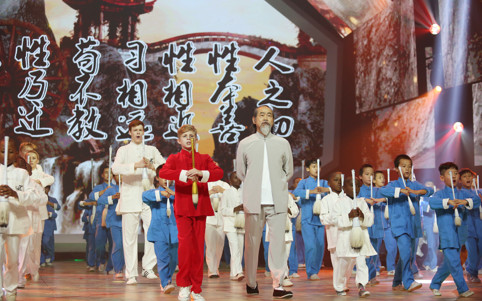 總決賽現場,太極大師元華帶著一群來自盧旺達、美國和湘西的小朋友表演《漢字功夫》。
