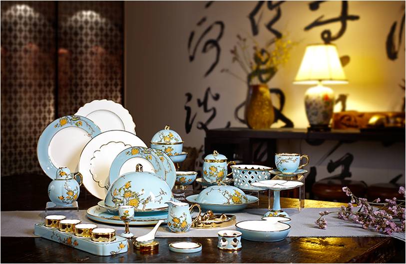 夫人瓷,集萃杭州元素、中國情結、世界語言、深圳精神,引西子湖水藍入瓷,融牡丹、如意、山水為畫,象征花開富貴、云水禪心美好寓意;配以大面積手工鑲金,融貫中西設計理念,完美演繹后現代藝術之美。
