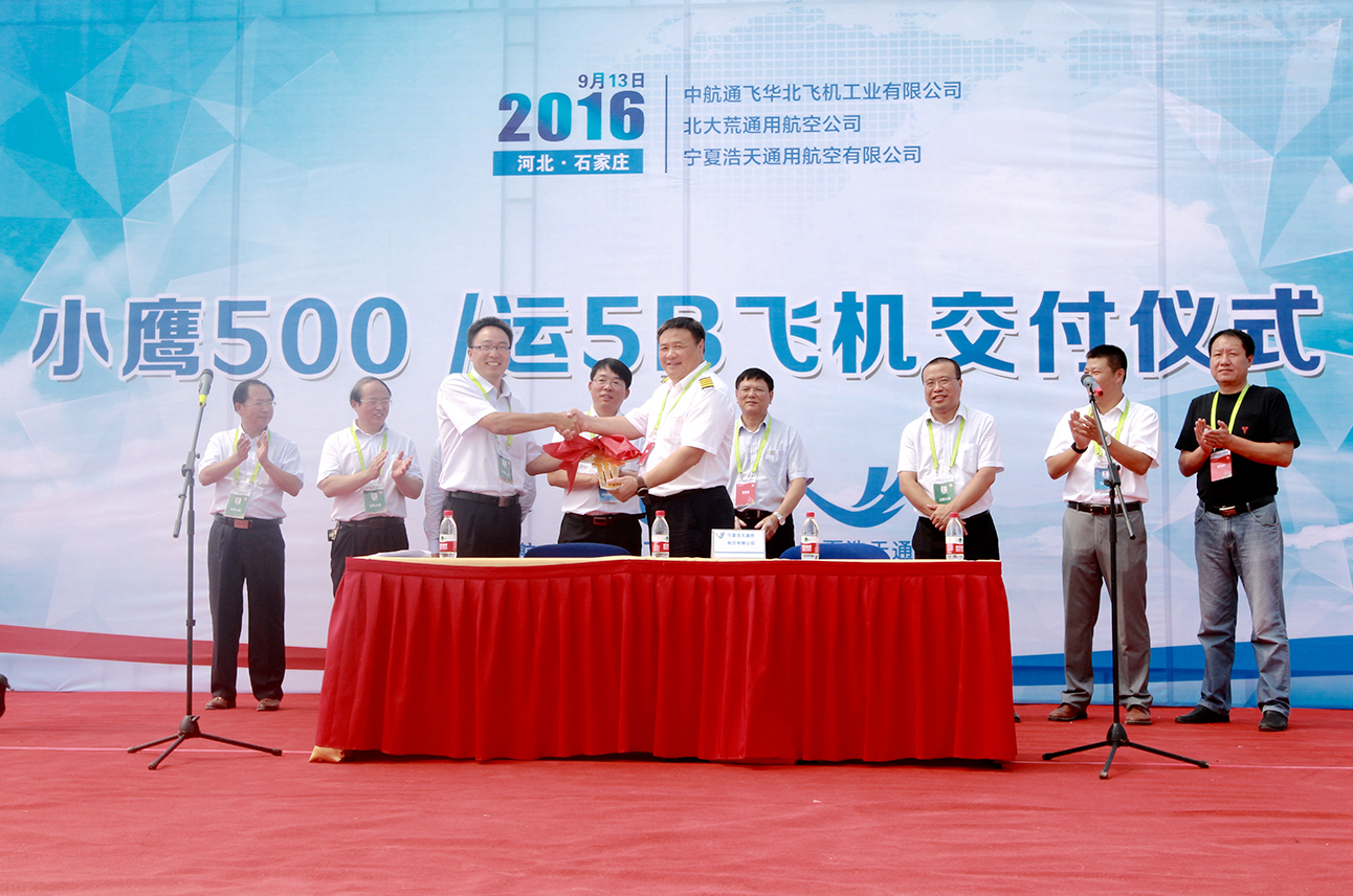 【香港商報网訊】記者陸紹龍石家莊報道:9月13日,石家莊通用航空展暨愛飛客飛行大會期間,中航工業通飛華北公司與北大荒通用航空公司、寧夏浩天通用航空有限公司在石家莊愛飛客小鎮前舉行小鷹500飛機、運-五B飛機交付儀式。