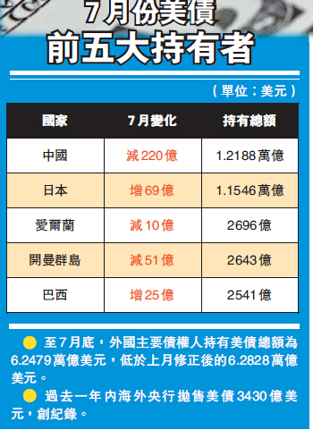截至今年7月底,外國主要債權人持有美債總額為6.2479萬億美元,低於上月修正後的6.2828萬億美元。7月份美債的前五大持有者順位仍然是中國、日本、愛爾蘭、開曼群島、巴西。