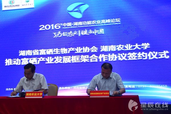 (首屆湖南功能農業高峰論壇暨“1223”富硒工程洽談會現場,湖南農業大學黨委書記周清明(左)與湖南省富硒生物產業協會執行會長兼秘書長楊俊(右)簽訂推動富硒產業發展框架合作協議。)