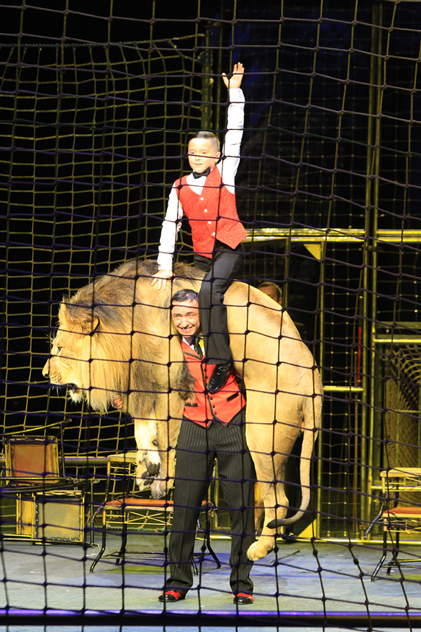 生性暴躁的雄獅團,在現場成了溫順的“小綿羊”。在雄獅軍團的創始人、烏克蘭人岡察洛夫·佛拉基斯拉夫的帶領下,它們有順序地出場,聽話地跳躍、安靜地蹲坐,令不少觀眾大開眼界。